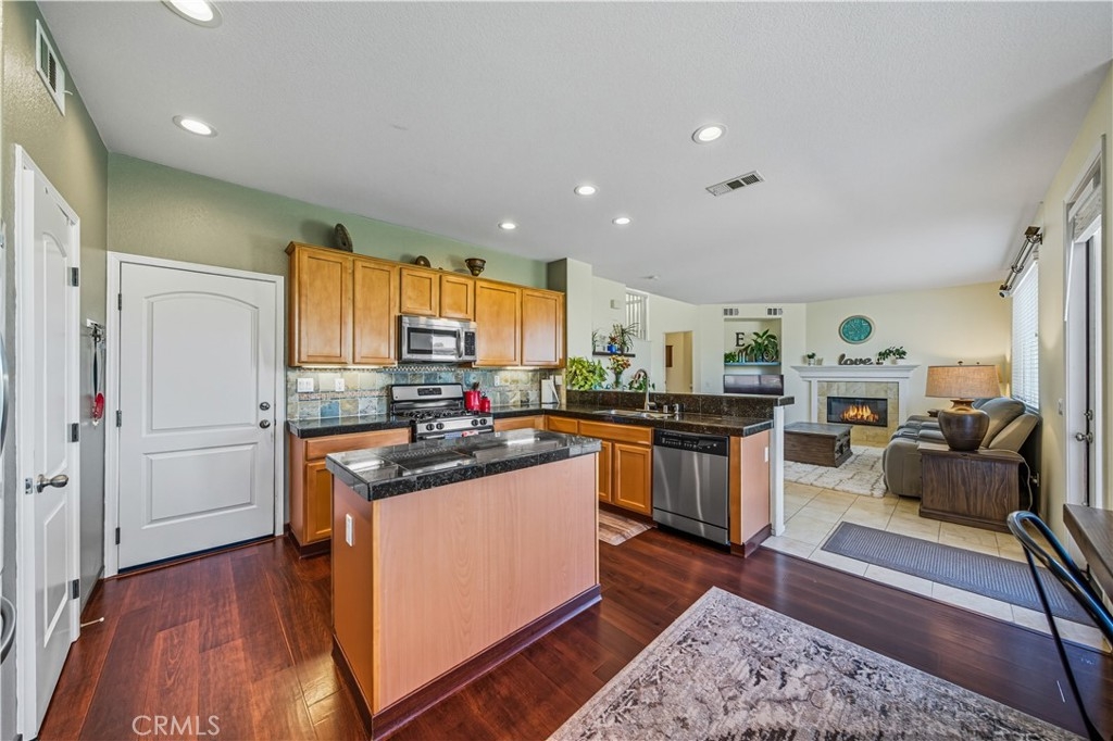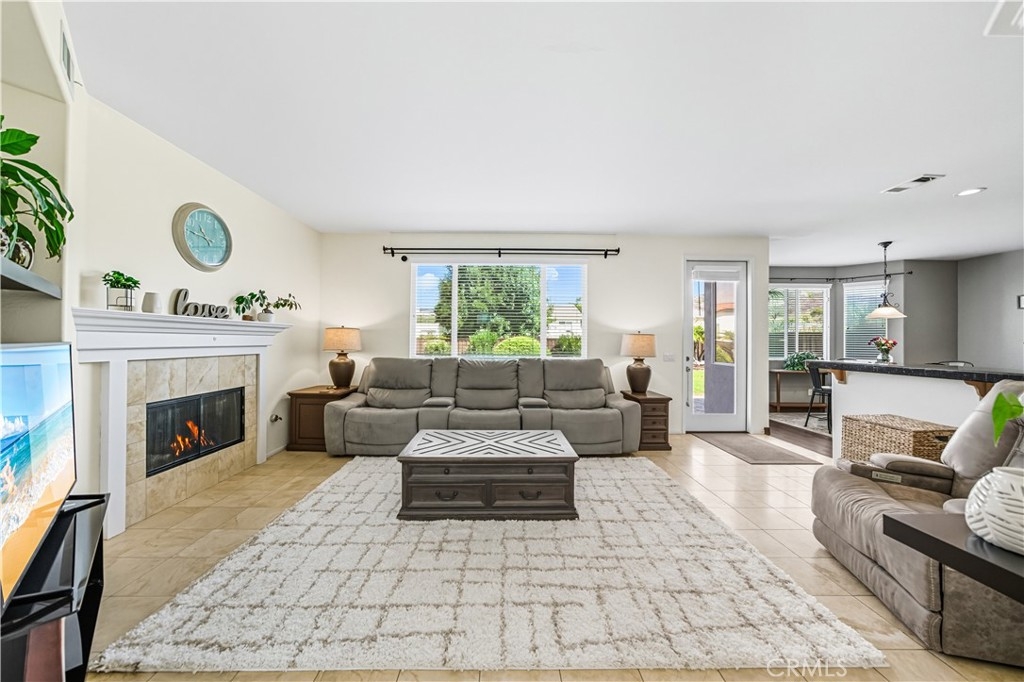 Step inside to an open-concept floor plan highlighted by wood floors and travertine throughout the main living areas. The family room with a cozy gas fireplace creates a warm gathering space, while the gourmet kitchen showcases granite countertops and stainless steel appliances.